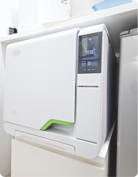 詳細な検査を可能にする機器や治療の精度を高める機器、快適な診療を支えるためのテンピュールのヘッドレスト、安全で清潔な機器を使用するための世界標準【クラスB】滅菌器を導入しております。