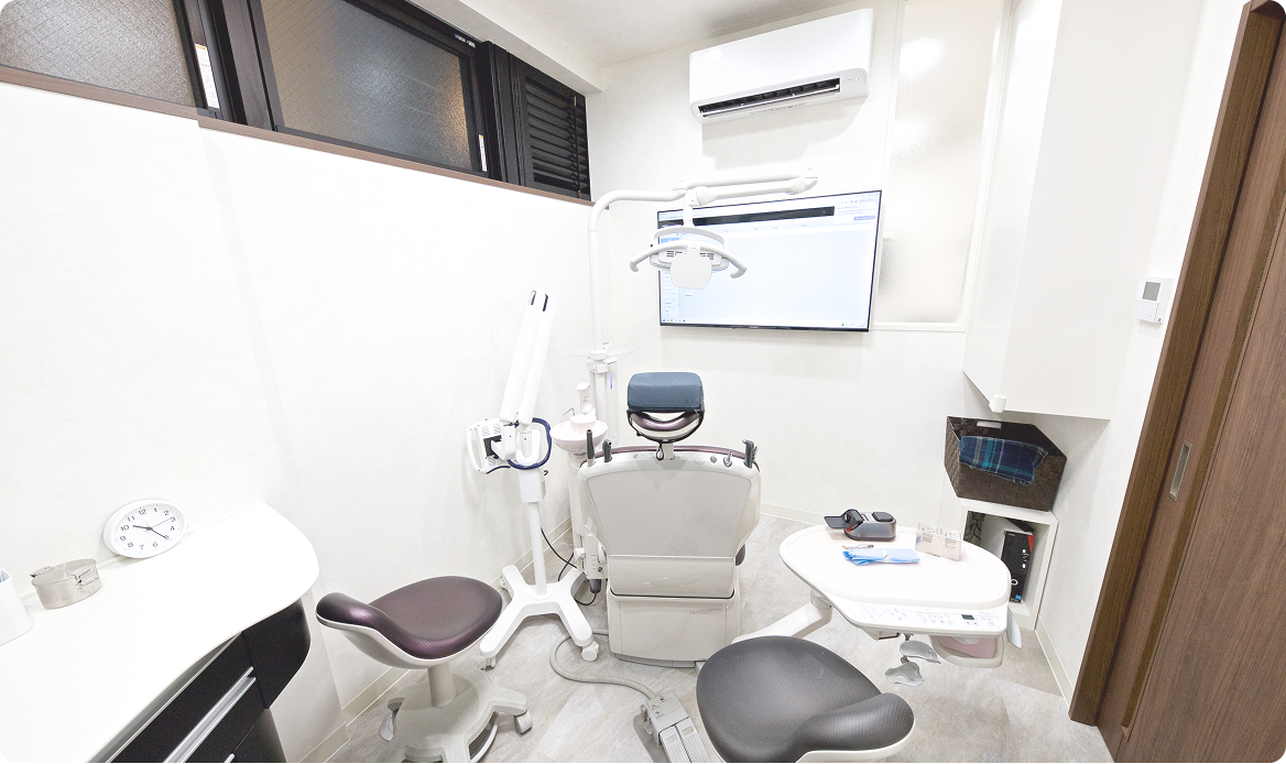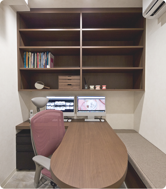 当院では精密な治療を行う診療室と歯科衛生士専用のケアルームがあります。全て個室になっておりますので、プライバシーが完全に守られています。